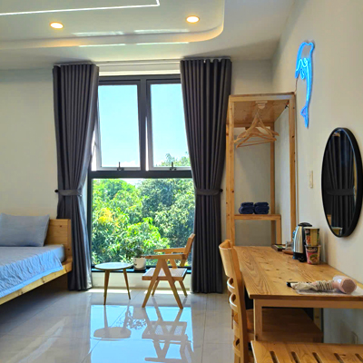 Phòng có 1 giường 1m6 được thiết kế lịch sự, trang nhã, đầy đủ tiện nghi, đặc biệt có rất nhiều cửa sổ nhìn ra không gian bên ngoài thoáng mát. Có trang bị tivi màn hình lớn kèm Netflix, rất thích hợp cho cho các cặp đôi muốn trải nghiệm cảm giác lãng mạng riêng tư.